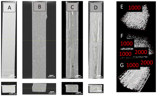 X-ray microtomography of a longitudinal (top) and transverse (bottom) section of the: (A) bare polymer TPU; (B) PL 8500 A-10%; (C) TPU10%; and (D) TPU20%. 3D renderings of the distributions for: (E) PL 8500 A-10%; (F) TPU10%; and (G) TPU20% reveal injection streamlines, dispersion disparities and flow aggregation.
