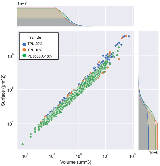 Particle analysis led to the conclusion (Figure 13) that the PL 8500 A-10% particles were generally more spherical (for a given volume, their surfaces were smaller) than their counterparts. Similarly, at the high end of the analysis, it is obvious that large fractions in the form of prolate volumes could be attained with the TPU particles, due to extensive shear smearing of particle-rich regions.