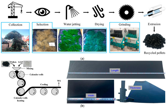 The recycled WS utilized in this study was sourced from local fishermen at Dalpo Port in Ulsan City, Republic of Korea. The production process of recycled WSs can be divided into two stages. In the first stage, after collecting and removing unsuitable components, the WFNs undergo a thorough cleansing process by a water jet to eliminate contaminants, followed by soaking in water to remove salt residues and impurities. After air-drying at room temperature, the WFNs are shredded into flakes, which are then extruded into pellets with particle sizes ranging from 5 mm to 7 mm, as shown in Figure 1a. In the second stage, the recycled pellets are melted and combined with long glass fibers (LGFs) in a weight ratio of 0.8:0.2. The mixture is then processed through calendering to form WSs with dimensions of 1500 × 300 × 3 mm, as depicted in Figure 1b. The added LGFs, with a tensile strength of 155 MPa and a density of 1.44 g/cm3, were intended to enhance the tensile strength of the recycled WSs.