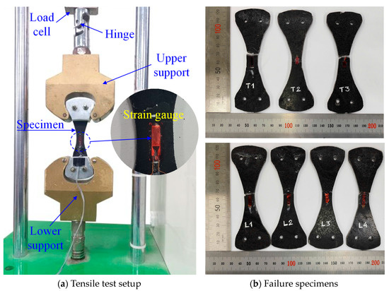 The tensile strength of the WS was tested according to ASTM D638 [43]. The dumbbell-shaped test specimens were made to determine the longitudinal and transverse tensile properties of the WS. In Figure 2, a strain gauge measured the tensile strain of the specimens within a gauge length of 6 mm, while a load cell on the universal testing machine (UTM) recorded the applied load data. The tests were performed at a steady loading speed of 2 mm/min, utilizing a UTM with a 5 kN maximum capacity. Figure 3 presents the tensile stress–strain curve for a WS material, established using a dose–response model [44] based on experimental data from test specimens. The elastic modulus of WS was derived from the slope of the elastic stage of the longitudinal stress–strain curve. For strengthening, a commercially available two-part epoxy impregnation resin (USCHEM Co., Ltd., Seoul, Republic of Korea, EP 202) was employed to adhere the WS to the slab surface. The mechanical properties of WS and epoxy resin are given in Table 2.