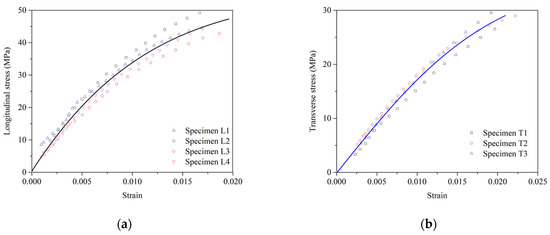 Tensile stress–strain response of a WS in the (a) longitudinal direction and (b) transverse direction.