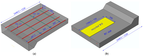 An experimental program was performed to evaluate the feasibility and effectiveness of WSs in the flexural strengthening of RC slabs. Two rectangular-section RC slabs were cast for this study, one serving as a control specimen and the other strengthened using a WS. The specimens were designed with a length of 2440 mm and a clear span of 2290 mm. For the control slab, the cross-section measures 130 × 900 mm2, with each test specimen featuring 5 longitudinal steel bars, No.13 (ϕ12.7 mm), spaced at 185 mm intervals along the bottom side of the RC slab. Additionally, the transverse reinforcement has 6 steel bars, No.10 (ϕ9.5 mm), spaced at 305 mm intervals, as illustrated in Figure 4a. Meanwhile, the strengthened slab was fabricated by attaching a recycled WS on the underside of the RC slab, as depicted in Figure 4b.
