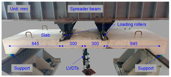 Figure 5 shows the four-point bending test setup, with both ends supported by rigid supports and two concentrated loads symmetrically positioned 300 mm from the centerline. Deflection data at the mid-span were measured using two linear variable displacement transducers (LVDTs) with an accuracy of 0.001 mm. A load cell with a capacity of 5000 kN, integrated into the UTM, measured the applied load. The load–deflection data were continuously recorded using a calibrated computerized data acquisition system. All tests were carried out at a controlled loading rate of 5 mm/min.