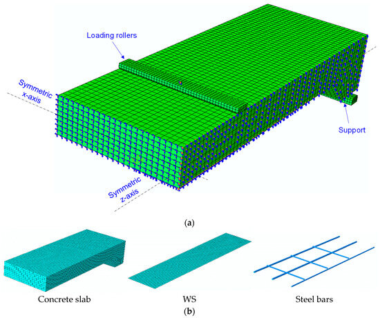 WS-strengthened slab model. (a) FEM meshing and boundary conditions and (b) elements.