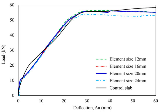 Achieving convergence of mesh densities is critical for the accuracy of numerical model solutions. Fine meshes can significantly increase analysis time, while coarse meshes may compromise result accuracy. Hence, four different mesh densities, ranging from 12 mm to 24 mm, were investigated in the preliminary analysis of the control slab model. A mesh size of 20 mm was recommended to obtain a balance between accuracy and computational cost. The outcomes of the mesh density investigation are shown in Figure 7. The FE model was constructed using 8-noded solid elements (C3D8R) for the concrete slab, 2-noded linear truss elements (T3D2) for the steel bars, and 4-noded shell elements (S4R) for the WS. The supports and loading rollers were modeled with 4-noded 3D rigid quadrilateral elements (R3D4), as summarized in Table 3.