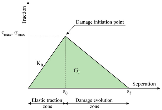 To model the interface between the WS and the concrete slab surface, a cohesive interface was created using the traction–separation law to allow debonding failure mode. A bilinear traction–separation model was used to represent the bonding properties of the linear adhesive at the interface, as illustrated in Figure 9 [52,53,54].