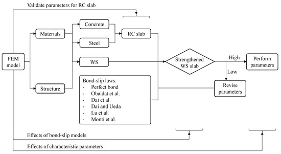 An analysis was conducted using FE modeling to simulate the behavior of a slab strengthened with recycled WS. First, an FE model of the control slab was validated against experimental results to ensure the proper values of input parameters for the RC slab model. Next, a strengthened slab was simulated by attaching a WS to the bottom side of the RC slab model. A perfect bond model and renowned bond–slip models were also used to analyze the WS-to-concrete interface and their effect on the debonding failure of the strengthened slab. Finally, adjustments to the characteristic parameters could lead to a good agreement with the experimental results, enabling an evaluation of their influence on the recycled WS-to-concrete interface. A diagram analyzing the impact of the characteristic parameters on debonding behavior is shown in Figure 10.