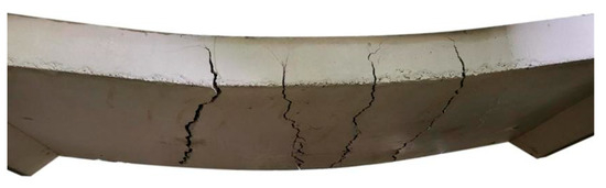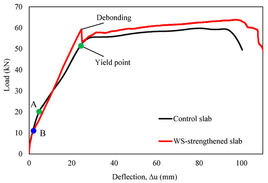 Table 6 summarizes the ultimate load, mid-span deflection, and initial stiffness for both the control and strengthened slab, whereas Figure 11 depicts their load–deflection (P−Δ) relationship. Figure 12 illustrates the failure mode of the control slab. In this test, the RC slab exhibited a linear-elastic response until microcracks emerged at an applied load of 18.9 kN on the bottom side near the mid-span section, as depicted by point “A” in Figure 11, marking the initial slope’s change. Afterward, the control slab maintained a linear-elastic behavior as the reinforcement reached the yield state at an applied load of 51.4 kN with a mid-span deflection of 24.1 mm. The ultimate load of the control slab was recorded as 59.7 kN, corresponding to a mid-span deflection of 80.5 mm. The slope of the P−Δ curve in the linear elastic stage can be utilized to analyze the initial stiffness [60]. In this case, the initial stiffness of the specimen was calculated as 2.31 kN/mm.