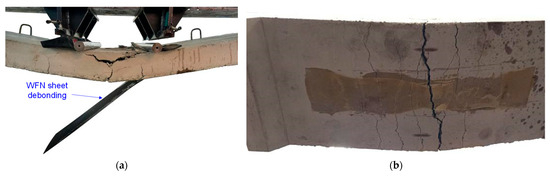 For the strengthened slab, it was observed that microcracks developed at a lower load (11 kN) compared to the control slab, as indicated by the change in slope at point B in Figure 11. It may be attributed to the limited area covered by the reinforcing layer (one-third of the slab width) and potential inconsistencies in material composition between specimens. Nevertheless, this discrepancy did not significantly influence its global response and load-carrying capacity. The strengthened slab exhibited linear-elastic behavior up to an applied load of 59.3 kN. Debonding failure then occurred, with a sudden load drop to 53.3 kN (an 11.3% decrease) at a mid-span deflection of 24.6 mm. After debonding, the global response of the slab matched that of the control slab, reaching the ultimate load of 63.9 kN at a mid-span deflection of 97 mm. The strengthened slab exhibited a 13% increase in initial stiffness compared to the control slab, reaching a value of 2.41 kN/mm. Remarkably, the strengthened slab maintained a linear-elastic response until WS delamination, increasing the yield load of the strengthened slabs relative to that of the control by 15%. It validated the feasibility of using recycled WSs for strengthening RC slabs. In addition, the debonding load was less than the ultimate load, and the WS did not experience significant damage, as shown in Figure 13. It indicates that the debonding failure of the WS from the concrete substrate reduced the load-carrying capacity of the reinforced element. It also confirms that using epoxy resin alone to bond these two materials might not maximize the strengthening effect. It is worth noting that the proportion of WS used is relatively small, offering an opportunity for optimization; the ultimate failure load will increase with increasing the area and number of layers of WSs, but is not proportional.