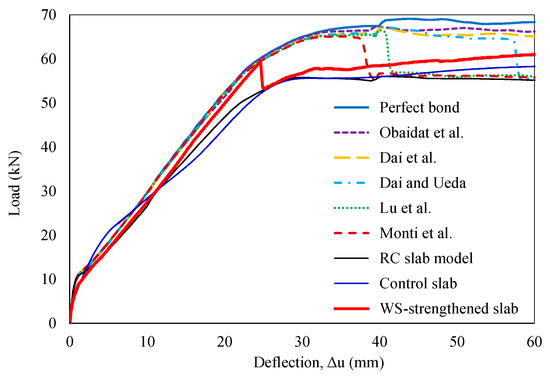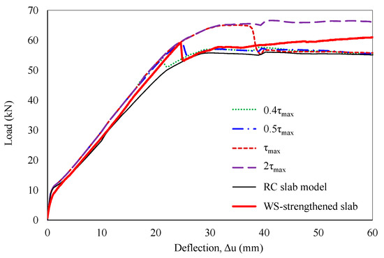 In addition, a sensitivity analysis of maximum interfacial shear stress, ranging from 0.4τmax to 2τmax, was performed to investigate its impact on debonding behavior. The results indicated a strong correlation between maximum shear stress and debonding failure, with earlier debonding observed at lower τmax values. Debonding occurred at loads of 52.9 kN, 59 kN, and 65.4 kN, with corresponding mid-span deflections of 21.4 mm, 24.7 mm, and 37.8 mm, at maximum shear stresses of 0.4τmax, 0.5τmax, and τmax, respectively. For maximum shear stress exceeding 2τmax, an idealized perfect bond was predicted. As a result, a maximum shear stress of 0.5τmax yielded a relatively accurate simulation of the strengthened slab’s global response, as shown in Figure 16.