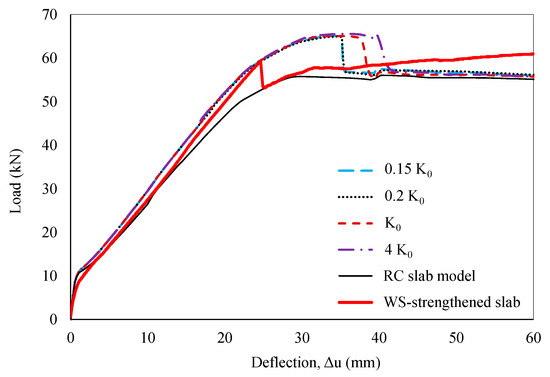 In summary, the characteristic parameters K0, τmax, and Gf significantly influence the global response and, more specifically, the debonding behavior of strengthened slabs. Accurate prediction of WS-strengthened slab behavior requires careful consideration of these parameters, along with the interaction between stress components. Moreover, the importance of these parameters for predicting the behavior of broader classes of externally bonded FRP- or WS-strengthened concrete structures is highlighted.