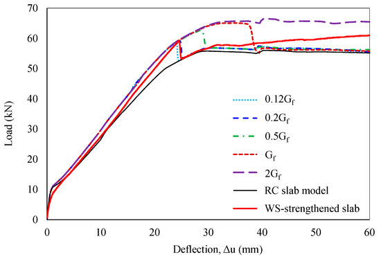 The influence of another characteristic parameter—interfacial fracture energy—was also further investigated, considering values from 0.12Gf to 2Gf. The debonding failure emerged earlier with decreasing Gf and vice versa, demonstrating a nonlinear relationship. Sensitivity to fracture energy was particularly evident within the 0.12Gf to Gf range, with debonding loads varying from 58.6 kN to 65.4 kN and corresponding mid-span deflections ranging from 24.1 mm to 37.8 mm. A perfect bond was predicted for interfacial fracture energy values greater than or equal to 2Gf. Remarkably, a fracture energy value of 0.2Gf enabled a reasonable simulation of the WS-strengthened slab’s behavior, as shown in Figure 17.