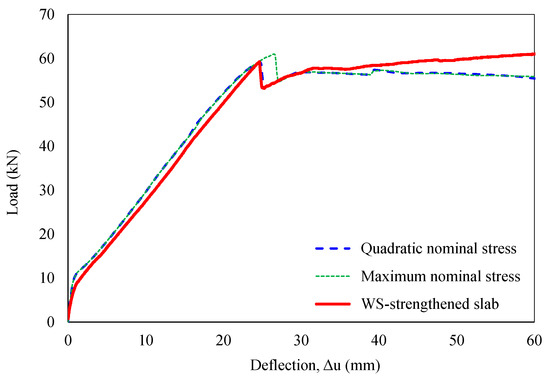 Based on the obtained results, this section analyzes two damage initiation criteria: quadratic nominal and maximum nominal stress. The quadratic nominal stress criterion considers the combined influence of all three traction components, while the maximum nominal stress criterion compares each component’s stress to its respective limit value [61]. As shown in Figure 18, the quadratic and maximum nominal stress criteria showed different mid-span deflections at 24.6 mm and 26.5 mm at debonding failures, respectively. Although consistent with the previous finding [30], the effect of damage initiation criteria on the strengthened slab’s response was less pronounced in this study. This discrepancy can be attributed to the smaller strengthened area (one-third of the slab width) compared to full-width strengthening employed in previous work. Accordingly, a significant influence of all stress components was recognized for decohesive elements during mixed-mode delamination initiation and propagation, consistent with the findings of Cui et al. [62]. Debonding could occur before any individual traction component reaches its allowable limit, with this phenomenon becoming more pronounced in wider strengthened sections.