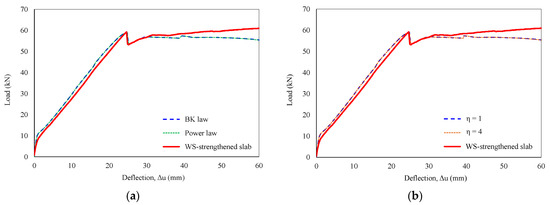Furthermore, the influence of fracture criteria under mixed-mode conditions (BK law and power law) on the P–Δ curve is explored in Figure 19a, along with a sensitivity analysis of the cohesive coefficient in Figure 19b. Notably, these parameters exhibited minimal impact on the debonding failure or the overall response of the slab.