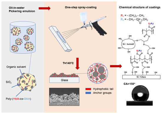 Applying superhydrophobic coatings to products with large surfaces and complex geometries remains a considerable technological challenge. Adapting and scaling the abovementioned methods are not always feasible or economically viable. The aerosol deposition of nanoparticle suspensions or polymer binder dispersions, followed by composite coating formation, is a more versatile and efficient approach. The roughness created by this method results from the aggregation of filler nanoparticles during solvent evaporation and their interaction with the polymer binder. Particles of silicon, zinc, titanium oxides, clay minerals, calcium carbonate, and graphene are the most widely spread as fillers for creation of micro- and nanotopology [26,27,28,29,30,31,32]. However, the use of flammable and explosive organic solvents, along with their evaporative loss during curing, is a considerable drawback. In line with the trends in “green chemistry”, it is preferable to use more environmentally friendly, water-based emulsion formulations [33,34].