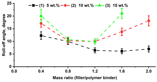The wetting and roll-off angles of the composite coatings were measured using an OCA 25 EC instrument (DataPhysics, Filderstadt, Germany) equipped with a tilting base unit TBU100. Deionized water droplets were applied to the substrate surface, and the contact angle of the stationary droplet was calculated using the Young–Laplace method. Statistical analysis was performed on the series of three samples of 10–15 measurements on each and the arithmetic mean of the contact angle was calculated.