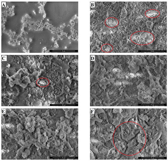 SEM images of coatings based on a 5 wt.% poly(HMA-co-GMA) solution, showing variations in the filler/polymer binder ratios: (A)—0; (B)—0.4; (C)—0.8; (D)—1.2; (E)—1.6; (F)—2.0 (4000× magnification).