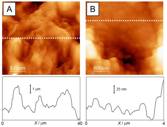 AFM images and cross-sectional profiles of the coating made from a 5 wt.% poly(HMA-co-GMA) solution with a filler/polymer binder ratio of 1.2 (sample 4). Mapping: (A)—40 µm × 40 µm; (B)—4 µm × 4 µm. The cross-sectional profiles are taken along the dotted lines indicated in the corresponding images.