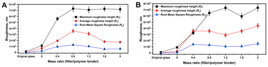 Dependence of Rt, Rq, and Rz of the composite coating (5 wt.% poly(HMA-co-GMA) solution) surface on the filler/polymer binder ratio for mapping areas: (A) 40 µm × 40 µm and (B) 4 µm × 4 µm.