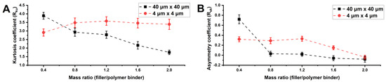 Dependence of Rku (A) and Rsk (B) of the surface of a composite coating composed of 5 wt.% poly(HMA-co-GMA) solution on the filler/polymer binder ratio for mapping areas of 40 µm × 40 µm and 4 µm × 4 µm.