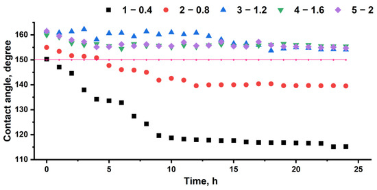 Dependence of the wetting angles on the contact time of a water droplet with the surface of polymer coatings made from 5 wt.% poly(HMA-co-GMA) solutions for various filler/polymer binder ratios: (1) 0.4; (2) 0.8; (3) 1.2; (4) 1.6; (5) 2. The pink line shows the boundary value of the wetting angle corresponding to superhydrophobicity.