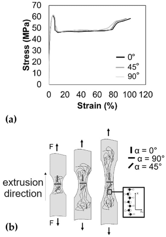 For a better understanding [63], refer to the tensile tests carried out following the ASTM standard D638-14 [64]; they determine the typical engineering stress–strain curves for engineering thermoplastics below the glass transition temperature [62], as reported in Figure 4a for specimens cut at 0, 45, and 90° relative to the extrusion direction. The first linear viscoelastic region is where the polymer chains undergo stretching and disentanglement in response to applied stress. This region ends at the yield point, after which increased strain occurs with reduced stress. This phase involves the breaking of van der Waals bonds and the occurrence of permanent deformations such as necking. Subsequently, the mechanically induced orientation of polymer chains (see Figure 4b) results in a steepening slope, up to the material’s breaking point [65].