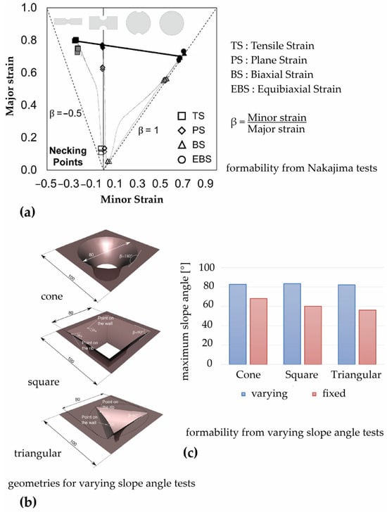 Formability of polycarbonate sheets: (a) forming limit curves from Nakajima tests on 2 mm thick sheets; (b) geometries used for varying slope angle tests and (c) maximum slope angle from varying and fixed slope angle tests on 1.4 mm thick sheets.