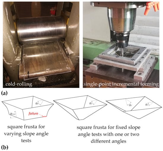 SPIF with preliminary cold-rolling: (a) equipment for the processing of the polycarbonate sheets and (b) geometries of the square pyramid frusta for the forming tests.