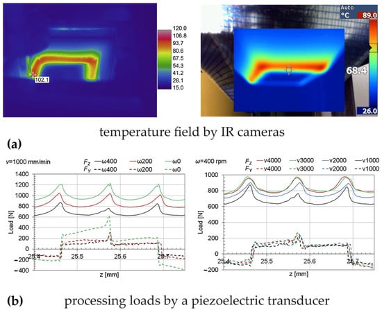 Other studies [77,78] have examined the self-heating abilities of the polycarbonate sheets during SPIF as a result of the travelling speed and the rotation of the tool. This allows for the control of the temperature at the tool/workpiece contact surface using infrared (IR) cameras (see Figure 8a). The tool rotation (from 0 to 400 rpm) and travelling speed (from 1000 to 4000 mm/min) were varied for the incremental forming of 2 and 3 mm thick sheets and their influence on the temperature and processing loads was determined (see Figure 8b).