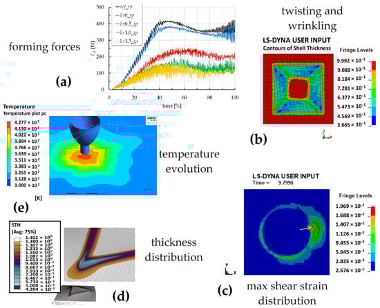 Overview of FEM analyses applied to the incremental forming of polycarbonate sheets: (a) trend of the forming forces; (b) defects and (c) deformation states; (d) thickness distribution; (e) temperature evolution.