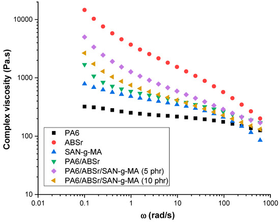 Complex viscosity curves for PA6, ABSr, SAN-g-MA, and polymer blends.