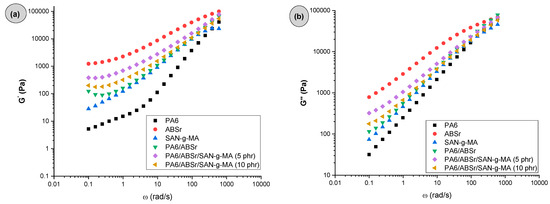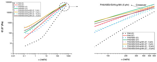 Figure 5 shows the behavior of the G′, G″ graphs as a function of angular frequency for PA6, the PA6/ABSr system, and the PA6/ABSr/SAN-g-MA blends. The displacement of the crossover when G′ (ɷ) coincides with G″ (ɷ) makes it possible to predict the increase or decrease in molar mass (MM) [50,51].