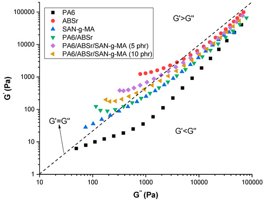 Figure 4 presents the G′ versus G″ graph for neat polymers and polymer blends, with and without the SAN-g-MA compatibilizer, to evaluate the viscous and elastic behavior. The G′ = G″ line divides the graph into two parts: above the line (G′ > G″), where the material presents a more elastic than viscous behavior; and below the line (G′ < G″), where the material presents a more viscous behavior [48,49]. The PA6 matrix had a viscous fluid behavior, considering that its curve remains below the G′ = G″ (G′ < G″ region). ABSr and SAN-g-MA transitioned from elastic to viscous behavior, especially in the 10–1000 Pa (G″) range. The PA6/ABSr and PA6/ABSr/SAN-g-MA blends also exhibited an elastic-viscous transition, more pronounced for PA6/ABSr/SAN-g-MA (5 phr). In the 10–1000 Pa (G″) range, the polymer blends are in G′ > G″, a predominant elastic response, while above 1000 Pa (G″), it changed to a more viscous behavior. Incorporating SAN-g-MA into the PA6/ABSr blend increased the G′ curve to a higher value than PA6/ABSr, especially at 5 phr. Consequently, the elastic character of the PA6/ABSr/SAN-g-MA (5 phr) blend was stronger, which is directly reflected in the improved impact strength and elongation at break, as discussed later.