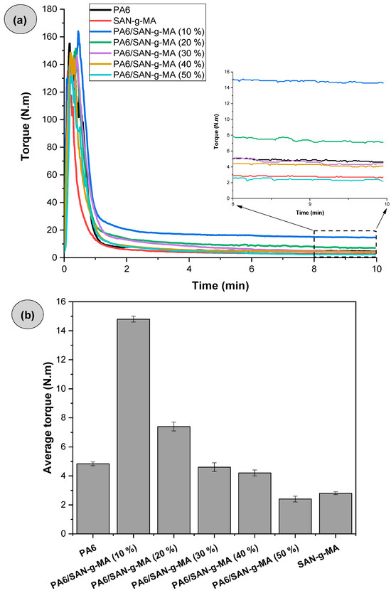 Torque rheometry of PA6, SAN-g-MA, and PA6/SAN-g-MA blends. (a) Curves of reactivity as a function of time. (b) Average stabilized torque in the 8–10 min interval.