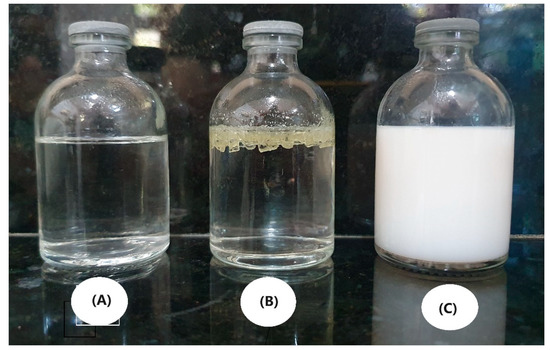 The Molau test was applied to investigate whether there was an interaction between PA6 and the SAN-g-MA compatibilizer, as shown in Figure 8. The PA6/SAN-g-MA (10%) blend was selected because it presented the highest torque value, suggesting a better reaction efficiency between the amine groups and maleic anhydride. The literature [56,57] has suggested that the Molau test effectively evaluates the reactive compatibilization of PA6-based blends using functionalized copolymers. In general, when a reaction between functional groups occurs, the solution formed becomes whitish due to the emulsion of the reacted material. Figure 8A shows a clear solution, indicating that neat PA6 dissolved in formic acid. On the other hand, SAN-g-MA did not dissolve in formic acid, and the granules precipitated on the surface. The PA6/SAN-g-MA blend formed a white solution, suggesting a reaction between the amine terminal groups and maleic anhydride, corroborating the torque rheometry. This behavior occurred because polyamide 6 dissolved in formic acid and dragged the SAN-g-MA phase, which reacted, generating a white solution. In this way, it is possible to notice strong evidence of the formation of a graft copolymer, as shown in the mechanism in Figure 7.