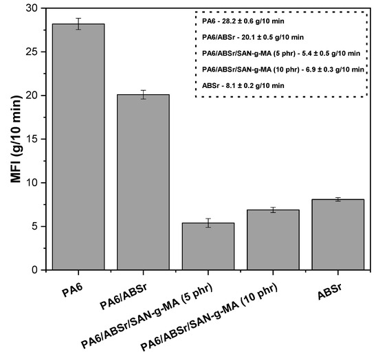 Melt flow index of PA6, ABSr, and polymer blends with and without SAN-g-MA.