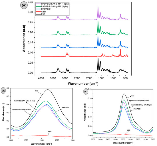 FTIR spectra of PA6, ABSr, and the polymer blends, with scans of: (A) 4000 to 400 cm−1; (B) 1600 to 1500 cm−1; (C) 3500 to 3100 cm−1.