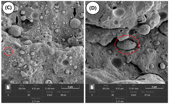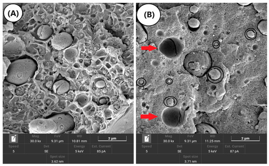 The PA6/ABSr blend presented a morphology with distinct phases (Figure 12B), showing spherical ABSr particles dispersed in the PA6 matrix and a heterogeneous particle size distribution. Furthermore, the PA6 matrix presented voids (red arrows) with a smooth internal surface, indicating low adhesion and high interfacial tension between PA6 and ABSr. The evidence suggests a low resistance interface that does not favor an effective stress transfer between PA6 and ABSr phases, which explains the low mechanical properties. The black circles indicate that several ABSr particles had no interfacial interaction with PA6, which is typical of an immiscible blend. Under mechanical stress conditions, the lack of interfacial interaction causes microvoids at the interface, leading to premature fracture. A notable feature in the PA6/ABSr morphology is the onset of inclusion cavitation inside the ABSr particle, resulting from the PP and PE contaminants.