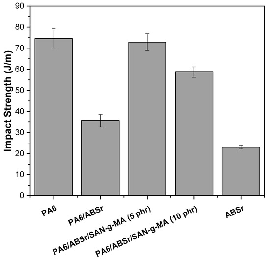 Figure 13 presents the Izod impact strength of neat PA6, ABSr, and PA6/ABSr blends with and without SAN-g-MA.