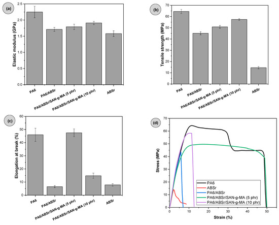 Mechanical behavior under tensile stress for PA6, ABSr, and polymer blends: (a) elastic modulus; (b) tensile strength; (c) elongation at break; (d) stress–strain curves.