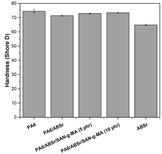 The Shore D hardness property is widely used in the plastic industry to measure the polymer resistance to surface penetration. Figure 15 shows the Shore D hardness behavior of PA6, ABSr, and polymer blends with different SAN-g-MA contents.