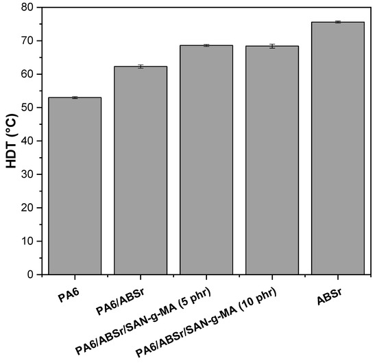 HDT analysis is very relevant for plastics applications, as it indicates structural stability, i.e., the resistance to deformation of the polymer at higher temperatures [72,73]. The HDT results of PA6, ABSr, and polymer blends with and without the SAN-g-MA compatibilizer are reported in Figure 16.