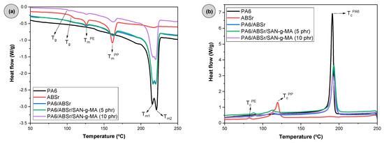 Figure 17b shows two crystallization temperatures (Tc) for ABSr, related to the polyethylene and polypropylene fractions. PA6 had a very intense Tc peak at 191.2 °C, analogous to that found by Zhang et al. [79]. The PA6/ABSr and PA6/ABSr/SAN-g-MA blends slightly increased the Tc value compared to neat PA6. Furthermore, the intensity of the Tc peaks of the polymer blends decreased since the amount of PA6 in the formulation was reduced. Regarding the degree of crystallinity, the highest value of 28.5% was obtained for PA6. The addition of ABSr negatively affected the degree of crystallinity of the PA6/ABSr and PA6/ABSr/SAN-g-MA blends, indicating no nucleating agent effect. The PA6/ABSr/SAN-g-MA (5 phr) blend presented a value close to that of PA6, probably contributing to the high mechanical tensile results and Shore D hardness. The reduction was more drastic for the PA6/ABSr/SAN-g-MA (10 phr), which coincides with the deterioration of mechanical properties compared to PA6/ABSr/SAN-g-MA (5 phr). This finding suggests that an excess of SAN-g-MA negatively impacted the degree of crystallinity, reducing the crystallinity to 23.5%.