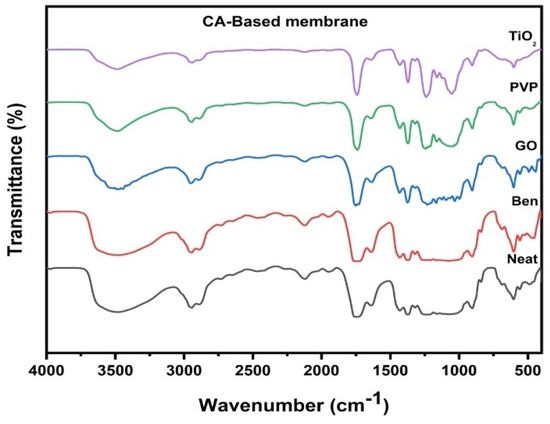 Kusworo et al. [38] subjected oil field wastewater to water treatment using the integrated activated carbon–bentonite adsorbent and double-stage membrane process. Analogous studies were also performed using GO and TiO2 composite ultrafiltration membranes, which yielded encouraging findings for applications involving wastewater treatment [39]. Though these nanoparticles, polymers, and clays have been incorporated into CA ultrafiltration membranes for the treatment of oil and water, their assessment, interactions, and performance parameters have not yet been investigated in detail as far as the research knowledge of the authors is concerned. Therefore, we conducted a research investigation to explore and assess the catalytic and adsorptive performance of CA membranes for the effective removal of oils and separation of water-in-oil emulsions, which is considered a novel endeavor.