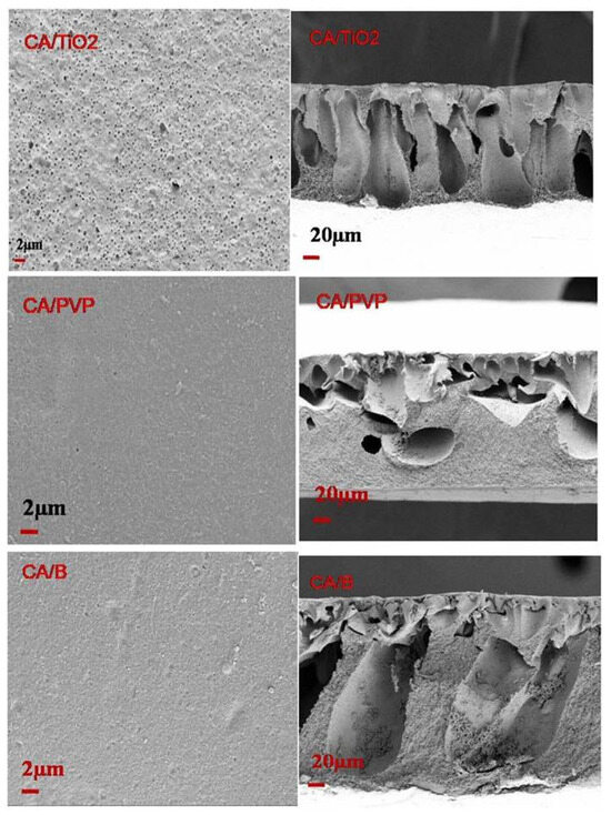 The top and cross-sectional images of CA-TiO2, CA-PVP, and CA–bentonite are displayed in Figure 2. The presence of nanomaterials in the top surface morphology is represented as white particles and the dense skin layer is obviously clear. In the fabricated CA-TiO2, CA-PVP, and CA-B membranes, the asymmetric structure was assumed to be a thick skin layer with a porous structure. Nanomaterials are considered to accelerate the phase separation process and affect the thermodynamic permanence of the casting solution when added to polymers, and the nanomaterials and polymer matrix membranes [48,49,50,51] have higher compatibility, which may be provided by the nanomaterials isolated uniformly with the polymers. Macrovoid structures were recognized in the porous sublayer of the CA-incorporated membrane cross-section and were composed of finger-like structures; they have been reported to reduce water transport resistance and enhance water flux in the membrane phase separation process [52].