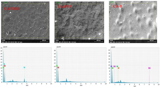 Figure 3 represents the Energy-Dispersive X-ray Spectroscopy (EDAX) spectra of CA-TiO2, CA-PVP, and CA-Ben. EDAX is a valuable analytical technique that is used primarily for elemental analysis and can provide important information regarding the composition of materials. For oil/water emulsion separation or removal of oil, EDAX was used to verify and confirm the presence of specific elements or materials in the membranes used in this study. The EDAX spectrum of the CA-TiO2-incorporated membrane displayed peaks corresponding to carbon, oxygen, and titanium. No other elemental peaks were detected, confirming the presence of oxygen or Ti. The figure also reveals the EDAX spectrum of the CA-PVP membrane in which carbon and oxygen peaks can be observed. The absence of other elemental peaks suggested that the CA-PVP membrane was primarily composed of carbon and oxygen, thereby justifying the presence of polyvinyl pyrrolidone (PVP). Likewise, the figure corroborated the presence of carbon, oxygen, aluminum, and silicon, confirming that the bentonite clay materials were found in CA–bentonite membrane blends [55]. The SEM results confirmed that the intended materials or additives (e.g., TiO2, PVP, and bentonite) were accurately incorporated into the membranes, and the results also provided valuable information about the presence of specific materials, which was crucial for ensuring the effectiveness of the separation process.