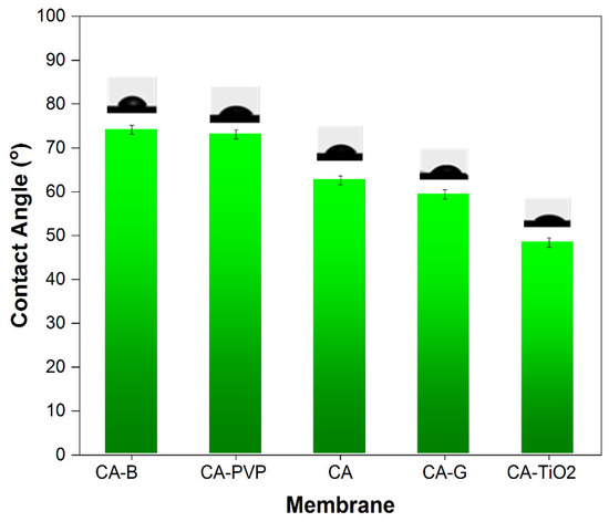 All the incorporated membranes were cleaned and dried in a vacuum oven for 24 h at 100 °C before applying them in the contact angle experiment [56]. The water contact angle (CA) values (Figure 4) provided insights into the wettability of the membrane surfaces. A smaller contact angle indicated better wettability, suggesting that water spreads more easily across the surface. The water contact angle of the neat CA membrane is 62.6°. The contact angle values increased in CA-Ben and CA-PVP and decreased in CA-GO and CA-TiO2 with the inclusion of CA nanomaterials: 74.1°, 71.3°, 59.4°, and 48.4°, respectively. These results thus indicated that the low contact angles of the membrane surface hydrophilicity were enlarged. The incorporated CA membranes exhibited increased hydrophilicity and enhanced hydrogen bonding with water-containing compounds. From the perspective of oil removal from oil/water emulsions, a lower contact angle is generally more favorable as it indicates that the membrane is more hydrophilic and, therefore, has a better affinity for water. This enhanced wettability facilitates the separation of oil from the emulsion [57]. In comparison to the neat CA membrane, the contact angles of the CA-TiO2 and GO membranes decreased, which implies the presence of a greater number of hydroxyl groups in both TiO2 and GO compared to PVP and bentonite. The addition of hydrophilic nanomaterials of TiO2 and GO to the CA mixed-matrix membranes resulted in higher wettability. These two membranes (CA-GO and CA-TiO2) were the most suitable for the removal of oil from oil/water emulsions because of their better wettability. Their hydrophilic nature indicates that they are likely to interact well with the water phase in the emulsion, which is beneficial for efficient oil separation [58].
