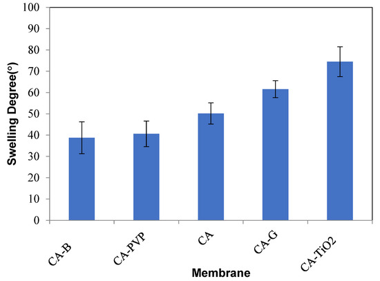Figure 5 displays the swelling degrees of neat CA, CA-B, CA-PVP, CA-GO, and CA-TiO2-incorporated membranes. The swelling degree of membranes is a critical factor in their performance for the removal of oil from oil/water emulsions. This affects the ability of the membrane to absorb or interact with the emulsion components, and the choice of swelling degree is dependent on the specific requirements of the separation process [59]. The swelling degrees of these membranes can be interpreted from the perspective of oil removal from oil/water emulsions based on the forthcoming facts. A high swelling degree indicated the fact that the CA-TiO2 membrane was capable of absorbing a significant amount of liquid, which could be advantageous for oil removal, whereas the swelling degree of CA-TiO2 composite membranes was observed to be higher than that of other membranes due to hydrophilicity and low contact angles. The extensive swelling condition specified that it absorbed more emulsion, thus potentially improving the separation efficiency [60]. In accordance with the justification mentioned, the CA-GO membrane also showcased a relatively high swelling degree, suggesting good absorbency and potential for effective oil removal, whereas neat CA exhibited a moderate swelling degree. They possessed a certain capacity to absorb emulsion, which rendered them suitable for general oil removal applications. CA-PVP revealed a lower degree of swelling than neat CA, which designated a lower capacity for emulsion absorption. However, this could be advantageous if the goal was to minimize swelling and retain the integrity of the membrane during oil/water separation. CA–bentonite had the lowest swelling degree, indicating limited capacity for liquid absorption. This could be beneficial in applications where maintaining the structural integrity of the membrane is considered a top priority. The cross-linked polymers of the nanoclay and CA-PVP-incorporated membranes exhibited a lower degree of swelling.