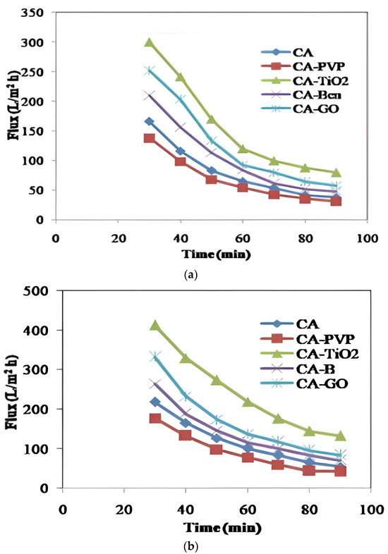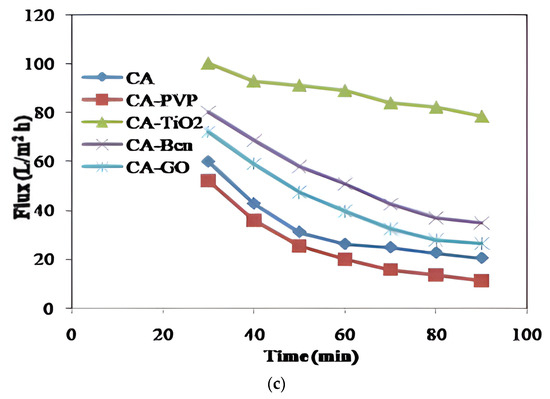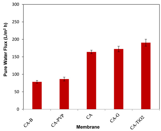 The pure water flux (PWF) of the membranes was calculated at different intervals at 30 min, 345 kPa transmembrane pressure (TMP), and 30 °C, as observed in Figure 6. The pure water flux values of CA-TiO2 were higher than those of the other membranes because of their low contact angles. The pure water flux values of CA-TiO2 were calculated and were noticed to be higher than those of neat CA and other composite incorporated membranes of CA in different mixtures of oil/water emulsions. Similarly, the addition of the TiO2 nanoparticles into the CA membranes resulted in the enhancement of the hydrophilic properties of the membrane since it had a greater number of hydroxyl groups, which in turn resulted in a reduction in the contact angle. The hydroxyl groups’ prevalence on the surface of the nanoparticles enhanced the interaction with water molecules, which resulted in a greater pure water flux ability than the CA membrane. Correspondingly, the CA-GO membrane achieved superior pure water flux to the CA membrane but was not much more significant than CA-TiO2. This was also due to the lower contact angle of CA-GO, which was due to the presence of a greater number of hydroxyl groups. In our previous study, we reported that the TiO2 nanomaterials have catalytic property and responsible for enhanced oil/water removal efficiency and high flux property [61]. In addition, the hydrophilic groups present in the TiO2 and GO nanoparticles accelerated rapid de-mixing and caused an increase in thermodynamic instability, which increased the porosity of the skin layer in the nanoparticle-embedded CA membranes. This resulted in an overall augmentation in the pure water flux of the nanoparticle-embedded CA membranes.