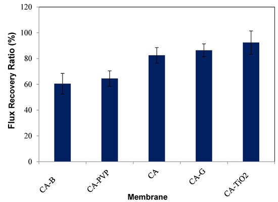 Figure 7 represents the flux recovery ratios of the membranes. The flux recovery ratio (FRR) is the measure of the conversion ratio after the water was supplied through the membrane separation (solution). The flux recovery ratio was calculated as per Equation (5) [62]. The FRR studies were performed using an ultrafiltration setup, with a volume of 400 mL and a membrane effective area of 38.5 cm2. Clean water and a synthetic oil/water mixture were used for flux studies prior to and after oil/water mixture separation at 345 kPa TMP. The flux recovery ratio of CA-TiO2 was higher than that of the CA, CA-B- and CA-PVP-incorporated membranes. It has been considered that a high FRR represents an enhancement of the antifouling property, and with the incorporation of TiO2 and GO into CA membranes, FRR was evaluated as 95.6% and 92.5%, respectively. Therefore, the CA-TiO2 membrane had confirmed positive effects on the performance and also revealed a considerable superiority in separation efficiency and flux recovery. CA-G also had a relatively high FRR value, indicating good recovery after cleaning, although neat CA with a moderate FRR value showed a reasonable ability to recover its filtration capacity. CA-PVP exhibited a lower FRR compared to pure CA, indicating a reduced ability to recover its initial filtration capacity after cleaning. CA-B, with the lowest FRR among the options, indicated that it may have more difficulty in regaining its filtration capacity after cleaning. The CA-TiO2 composite membrane demonstrated a heightened separation performance for oil solutions, with an excellent flux recovery ratio under pressure in UF membranes. A higher FRR value of CA-TiO2 demonstrated its better ability to regain and maintain its filtration performance after fouling or clogging, which is essential in processes such as the removal of oil from oil/water emulsions.